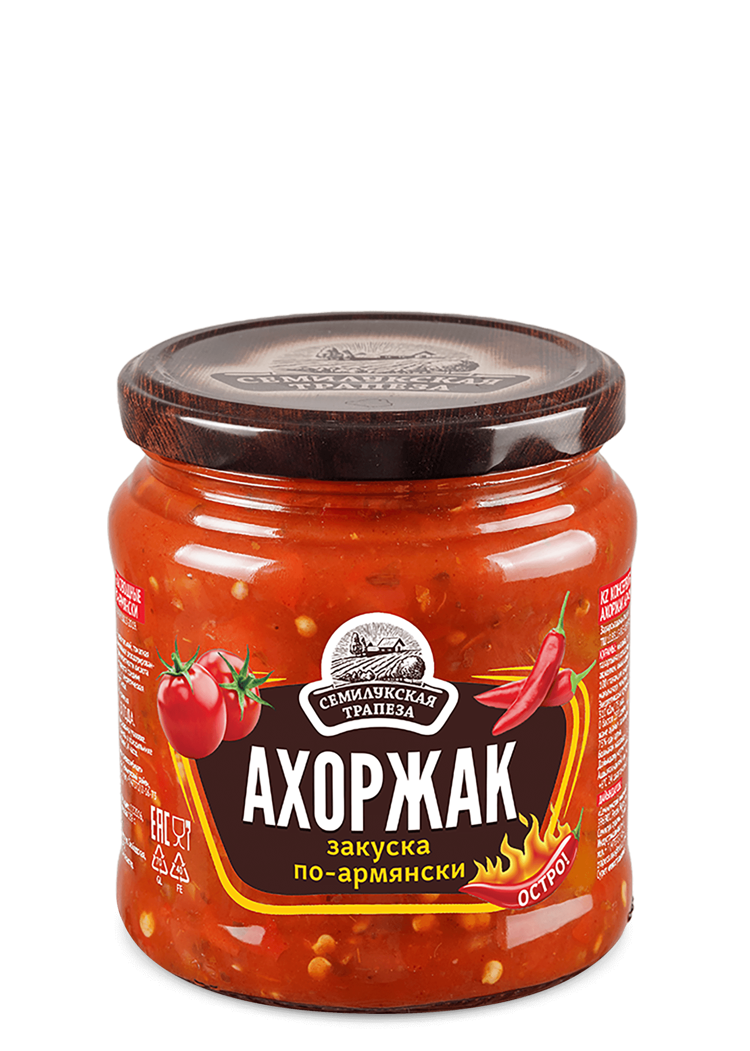 Ахоржак — традиционная закуска армянской кухни, сравнивая по технологии приготовлении со знакомой аджикой. На производстве компании «Семилукская трапеза» её готовят на основе острого перца и помидоров. Она получается очень аппетитной, жгучей и насыщенной по вкусу. Закуска «Ахоржак» хороша в дополнении к мясным блюдам и гарнирам из круп.