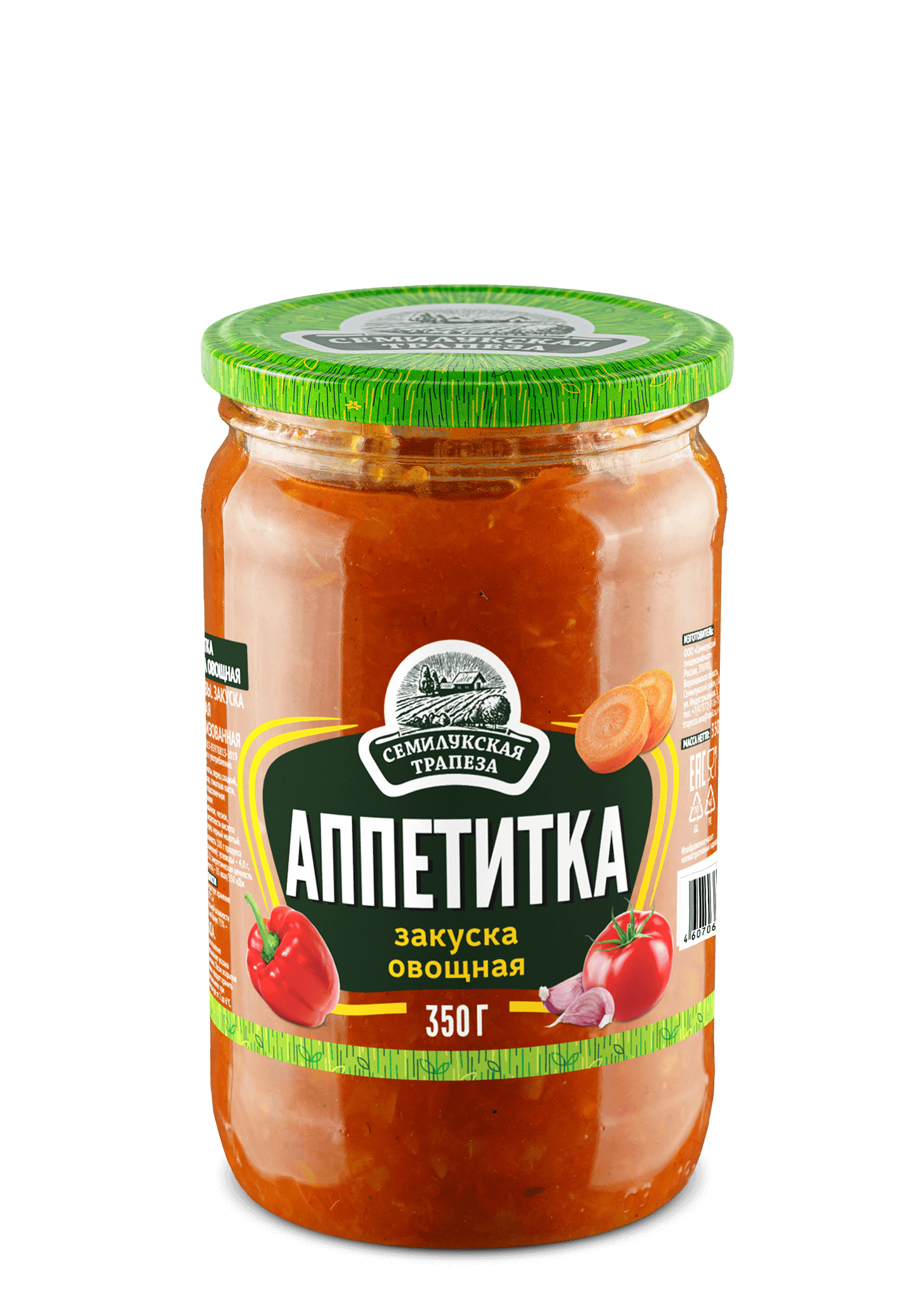 Традиционно «Аппетиткой» называют закуску на основе томатов с добавлением других овощей. На предприятии «Семилукская трапеза» есть своя технология приготовления такой закуски. Сочные спелые помидоры, сладкий перец и морковь приправленные душистым чесноком и чёрным молотым перцем в составе этой ароматной закуски, придают неповторимый аромат, способный разбудить аппетит у каждого кто её попробует.