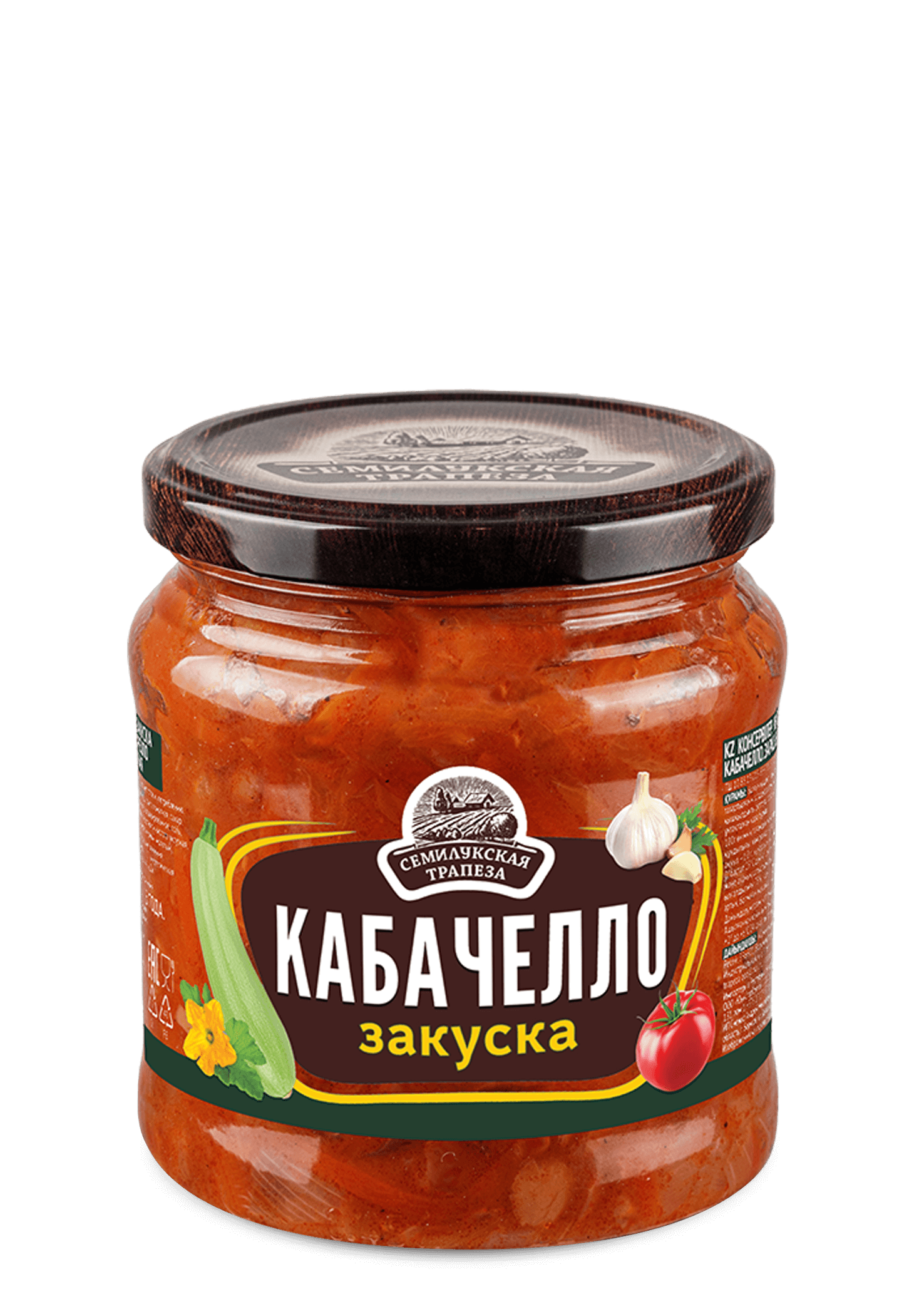 Компания «Семилукская трапеза» представляет идеальный вариант закуски для любителей нежных кабачков с брутальным названием «Кабачелло». Эта закуска настолько универсальна, что подойдет в дополнение к любым блюдам.
