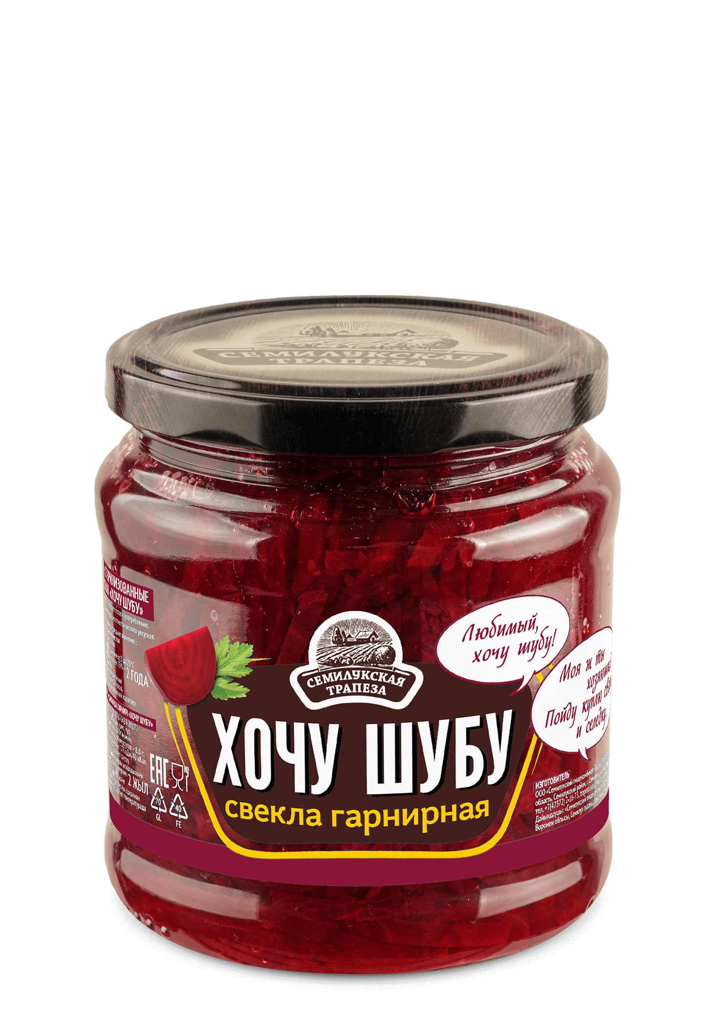 Наверняка нет того человека, который ни разу не пробовал один из самых традиционных салатов русского застолья «Сельдь под шубой", рецепт которого знает каждая хозяйка! Свекла гарнирная "Хочу шубу" марки "Семилукская трапеза" станет не просто вкусным дополнением к любимому блюду, но и поможет сэкономить драгоценное время на его приготовление. Использование только натуральных компонентов и современного оборудования при производстве, позволяет сохранить все полезные свойства и неповторимый цвет алого корнеплода, так необходимый для красивого оформления салата.