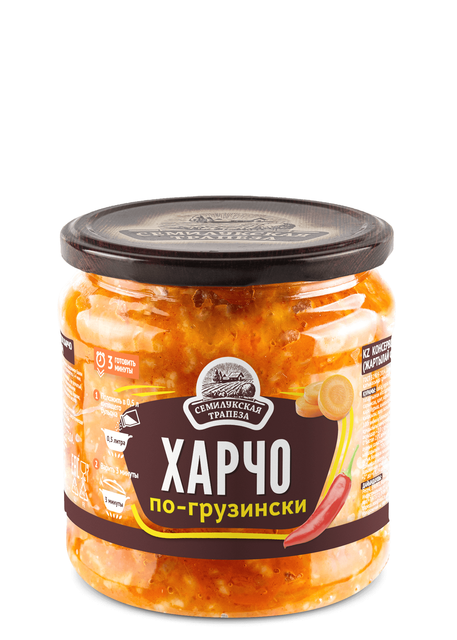 Сытный и ароматный суп Харчо — несомненно можно назвать королём грузинской кухни! Морковь, рис, картофель, репчатый лук с заправкой из натуральной томатной пасты с добавлением душистого кориандра, базилика и других пряностей — все это ингредиенты «Харчо по-грузински» марки «Семилукская трапеза». Приготовьте его на мясном бульоне и вкус этого первого блюда несомненно перенесёт вас в атмосферную Грузию!
